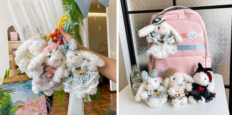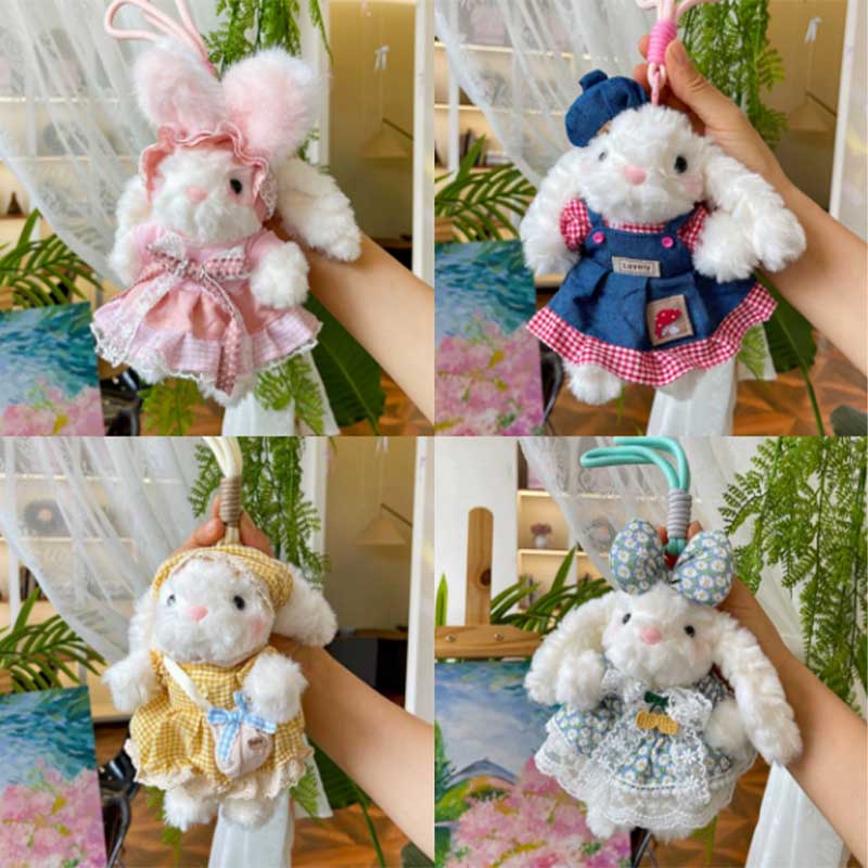 Bạn có thể mua một con thỏ thông thường, không có bất kỳ phụ kiện hoặc trang phục nào. Keychain động vật sang trọng của chúng tôi có nhiều phong cách khác nhau. Chúng có thể được kết hợp với nhiều loại quần áo và phụ kiện khác nhau, và có rất nhiều lựa chọn. Trang trí treo sang trọng này được cả trẻ em và nhiều cô gái yêu thích.